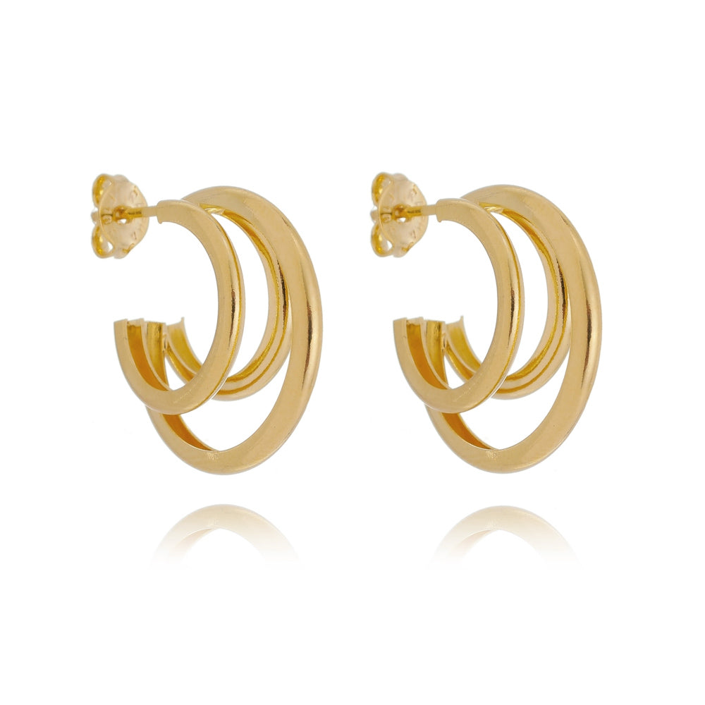 Brinco argola tripla moderna banhado a ouro 18k. Composto por três aros interligados, este design sofisticado é perfeito para quem busca um acessório elegante, versátil e cheio de estilo. Ideal para looks do dia a dia ou ocasiões especiais.