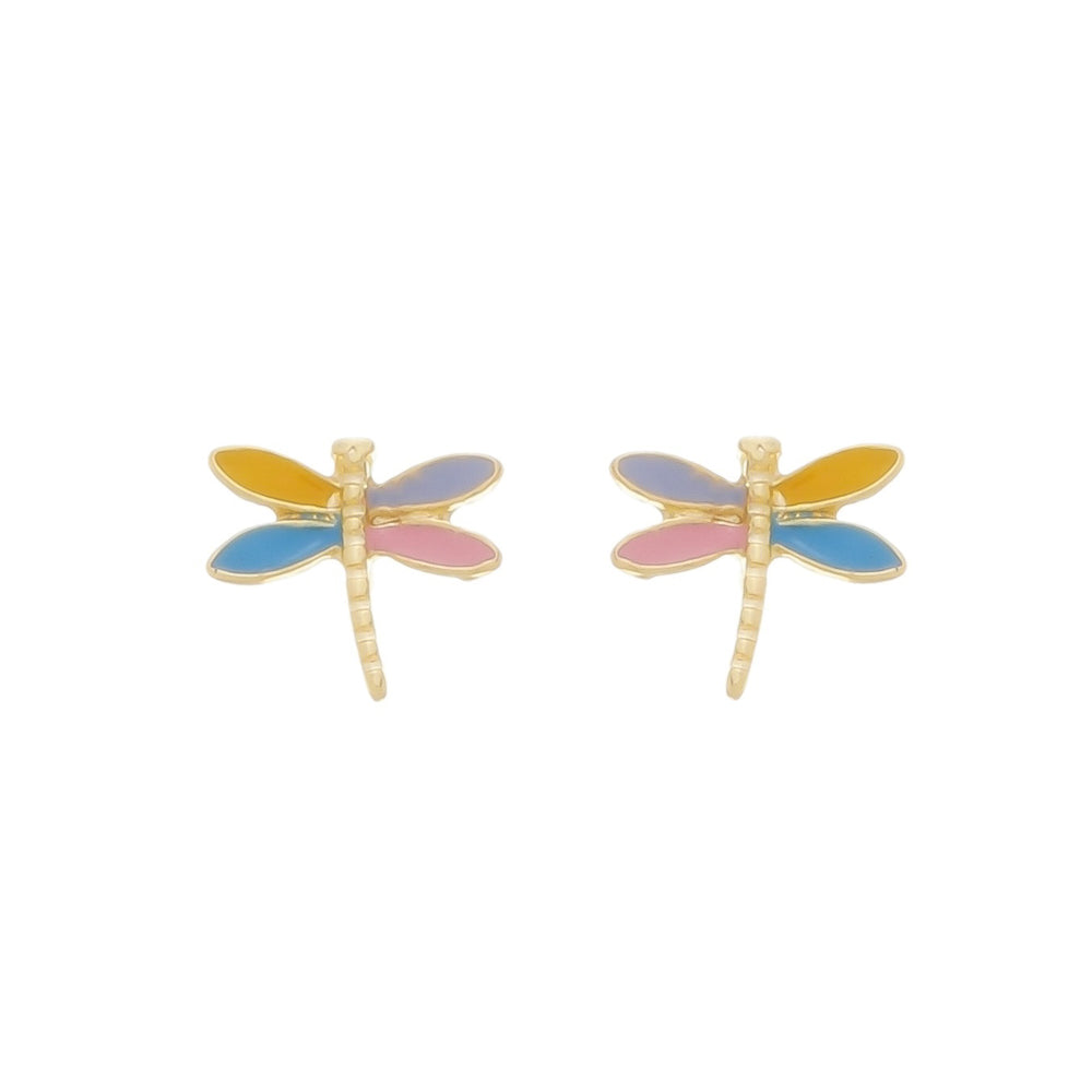 Brinco infantil em formato de libélula colorida, banhado a ouro 18k. As asas possuem esmaltação em tons vibrantes de amarelo, roxo, rosa e azul, trazendo um toque alegre e delicado ao visual. Perfeito para crianças ou para quem busca um acessório divertido e cheio de charme.