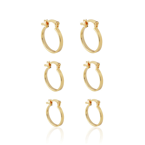 Kit com 3 pares de brincos de argola lisa banhados a ouro 18k, perfeito para quem ama um visual minimalista e elegante. Com acabamento polido e brilho sofisticado, essas argolas são peças curingas para qualquer ocasião.