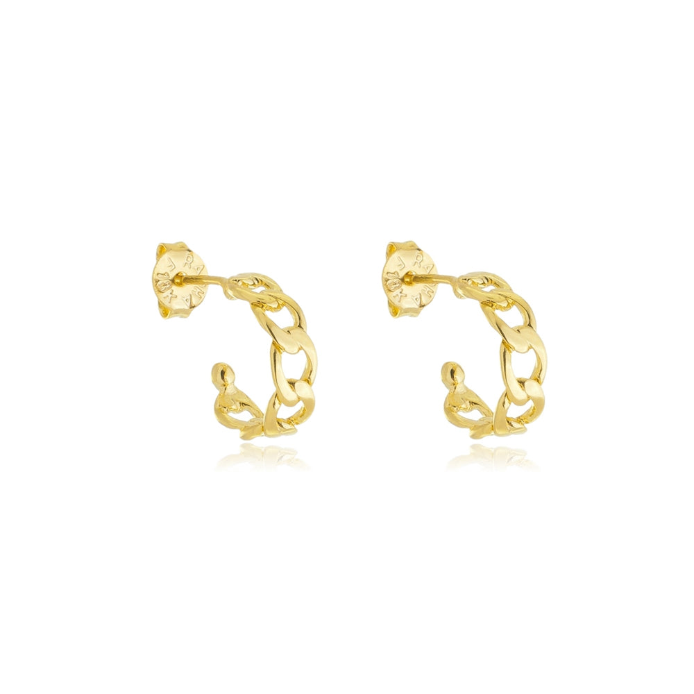 Brinco meia-argola banhado a ouro 18k com design de elos de corrente, que une estilo urbano e elegância em uma única peça. Seu visual moderno e versátil é perfeito para compor produções do dia a dia com um toque de atitude e sofisticação.