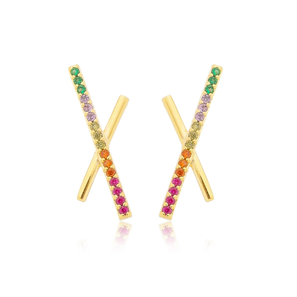 Brinco moderno em formato de “X”, com uma das hastes cravejada com zircônias coloridas em tons vibrantes e delicados. Banhado a ouro 18k, combina elegância com um toque descontraído, ideal para composições autênticas e cheias de personalidade. Leve e confortável, é perfeito para uso diário ou para dar destaque a produções mais ousadas.