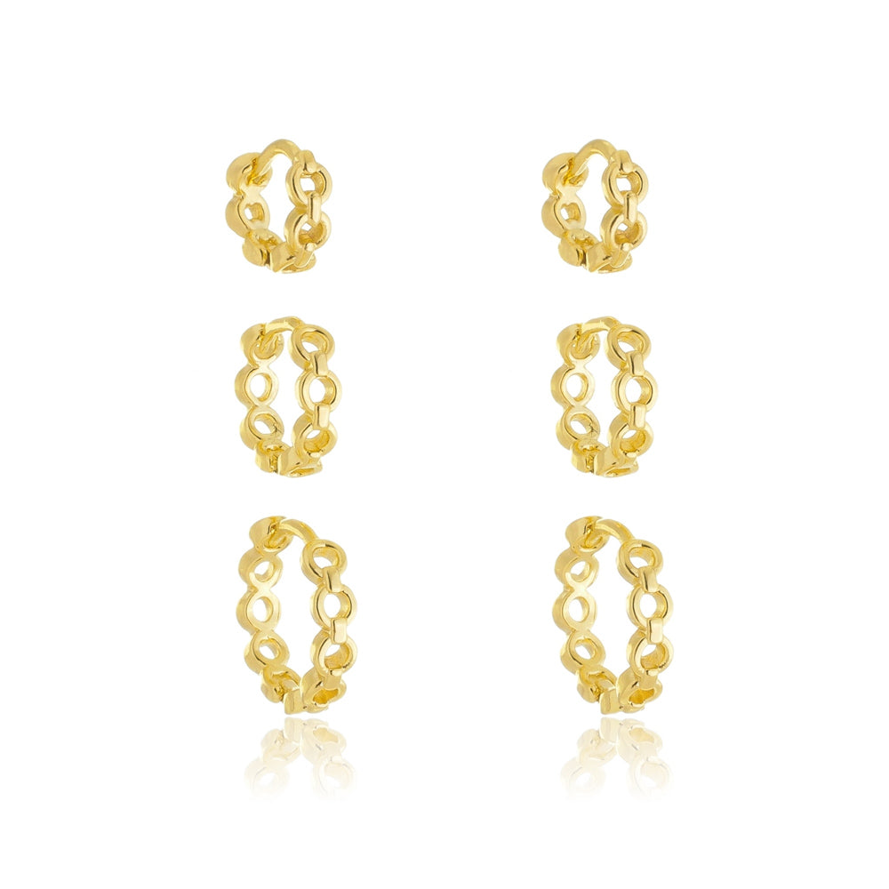 Kit com 3 pares de argolinhas banhadas a ouro 18k com design de elos vazados, ideal para quem ama estilo e versatilidade. Com tamanhos variados e acabamento polido, esse trio de argolas é perfeito para composições em orelhas com múltiplos furos, trazendo um visual moderno, elegante e harmônico.